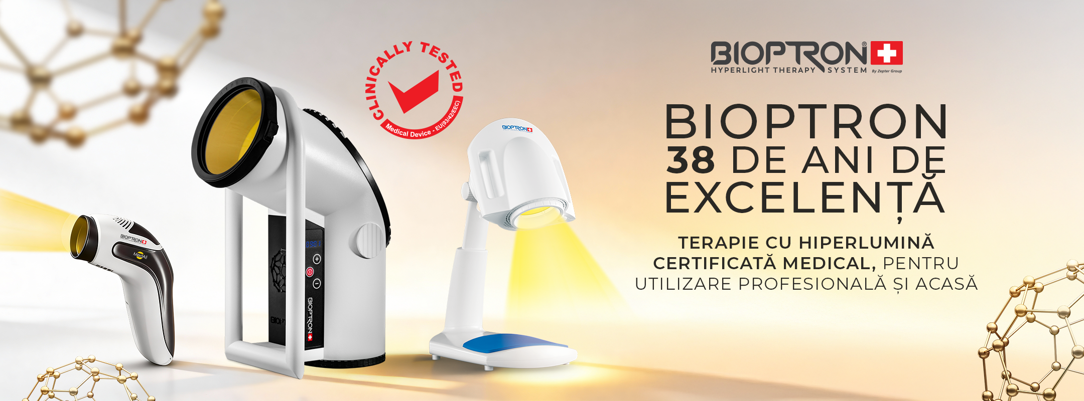 BIOPTRON® Hyperlight este un dispozitiv medical de terapie cu lumină clinic testat, brevetat, dovedit și certificat, utilizat în spitale, instituții specializate, centre de wellness și sport și acasă. BIOPTRON® Hyperlight a fost acceptat ca o formă unică de terapie, prevenire a bolilor și recuperare pentru diverse indicații medicale și probleme de sănătate.